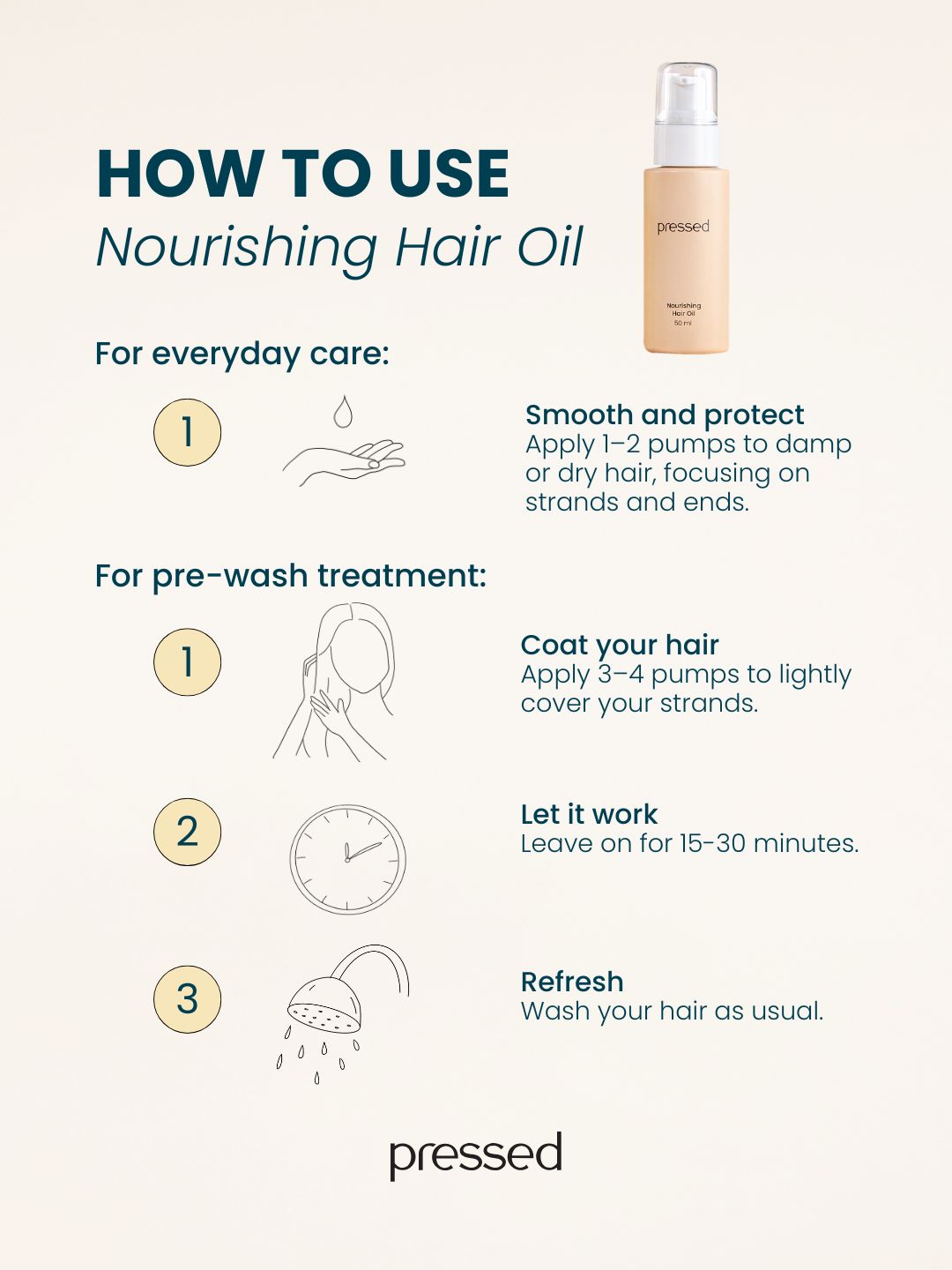 The Nourishing Hair Oil is formulated to strengthen, smooth, and protect the hair fibre using a balanced blend of seed and flower oils combined with an oil-based protein. By targeting gaps in the hair cuticle caused by damage, dryness, or styling, the formula helps reinforce weak strands, improve softness, and restore natural shine without weighing hair down.